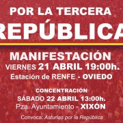 VIERNES 21: 19:00h MANIFESTACIÓN “Por la Tercera República” convoca Asturias por la República. Salida: Estación de RENFE. + MITIN en Pza Porlier.